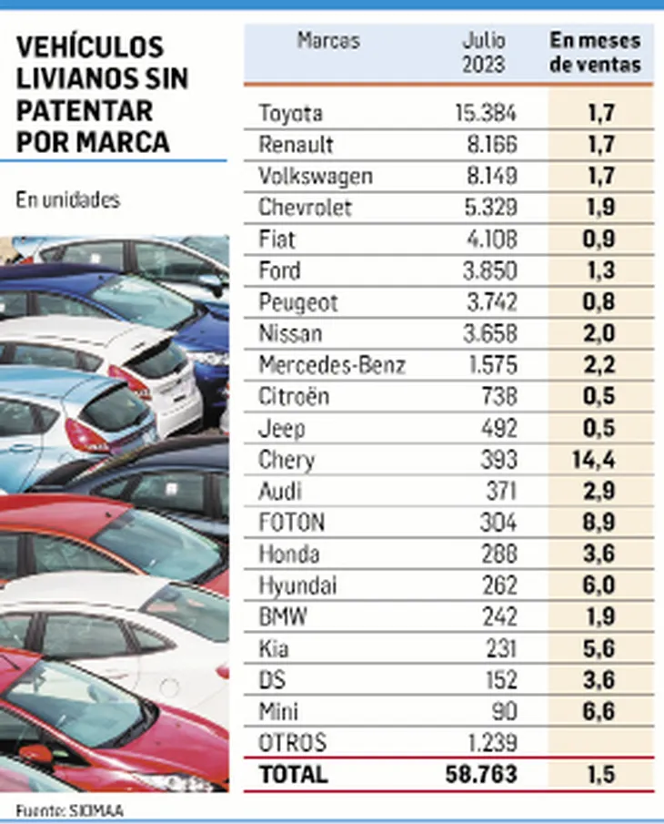 Según los últimos datos de Julio, a los que accedió Ámbito, el stock total de autos en el mercado era de 58.763 unidades. Esto equivale a un mes y medio de ventas. Lo normal es que el stock represente unos tres meses de ventas para poder tener a la red abastecida.