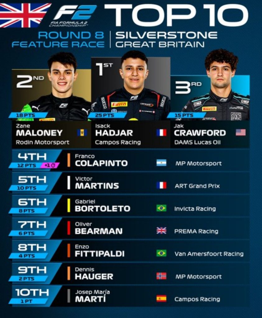 Un fin de semana con resultados por demás positivos completó Franco Colapinto en el circuito de Silverstone, en donde culminó su actuación con la competencia dominical de FIA Fórmula 2 en la cual pudo arribar en la cuarta posición a bordo del coche de MP Motorsport, en una prueba que tuvo varias incidencias en el desarrollo de las 29 vueltas.