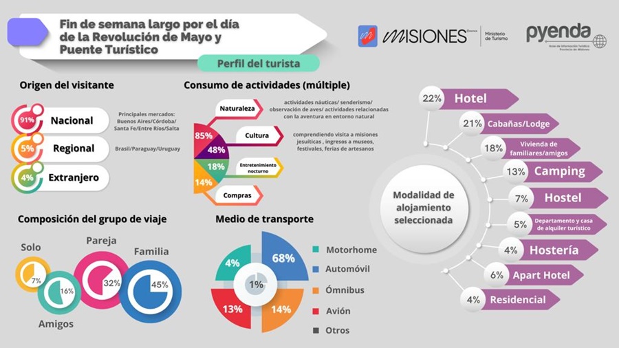 Según datos brindados por el Ministerio de Turismo de la provincia de Misiones, el fin de semana extralargo por el feriado de la Revolución de Mayo y el puente turístico, se registró una ocupación promedio de alojamiento del 95% en la provincia, más de 30 mil arribos, una estadía de 3,8 noches, más de 111 mil pernoctaciones y un gasto promedio por visitante de 15.000 pesos.