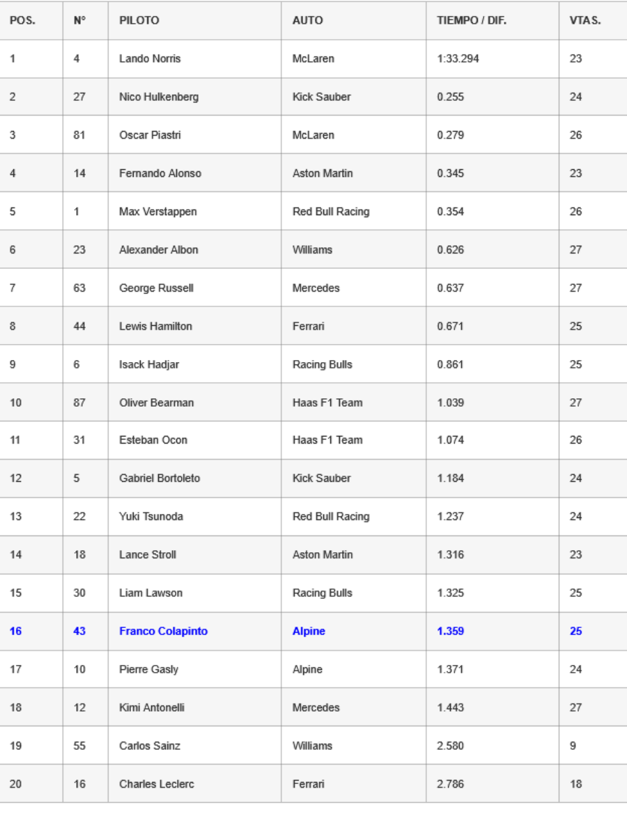 Trabajando en la única sesión que tiene de este día viernes, el piloto argentino Franco Colapinto giró con neumáticos duros en el inicio y terminó calzando compuesto blando en su A525; el más rápido fue el McLaren de Norris.