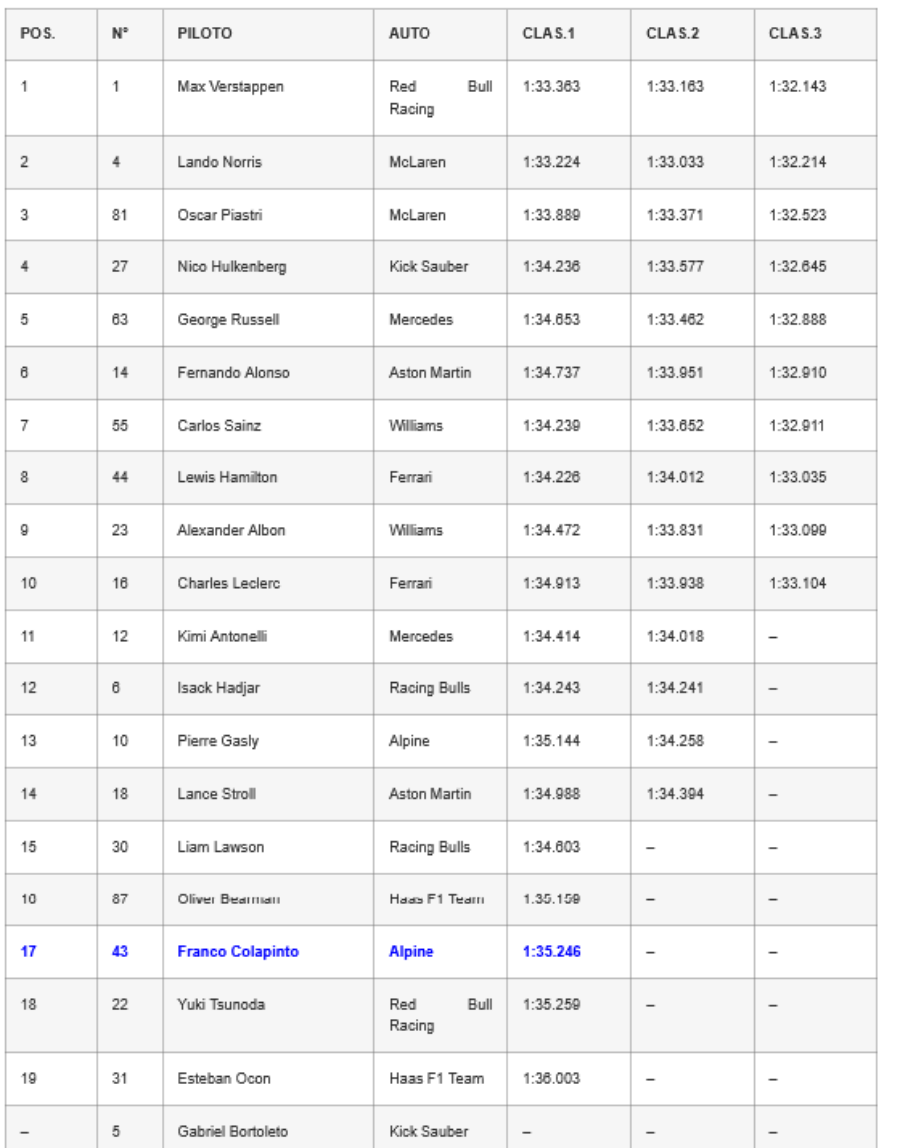 No se concretó el objetivo de Franco Colapinto y Alpine F1 Team para superar el primer corte clasificatorio correspondiente a la carrera Sprint que se realizará este sábado en el marco del Gran Premio de Estados Unidos, y con el Alpine A525 el piloto argentino quedó ubicado en la tabla de tiempos en el 17° puesto, tras cronometrar 1m35s246 en el último de los cinco giros que pudo completar en la pista del Circuito de las Américas, de 5.513 metros.