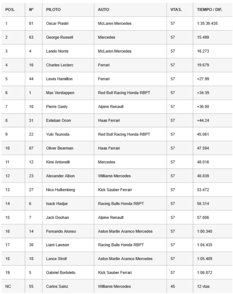 Cumplida la cuarta fecha del calendario, Norris cuenta con 77 puntos en el campeonato mundial y supera por tres (3) a Piastri. Tercero quedó Verstappen a ocho (8) seguido por Russell (a 14) y Leclerc (a 45).
