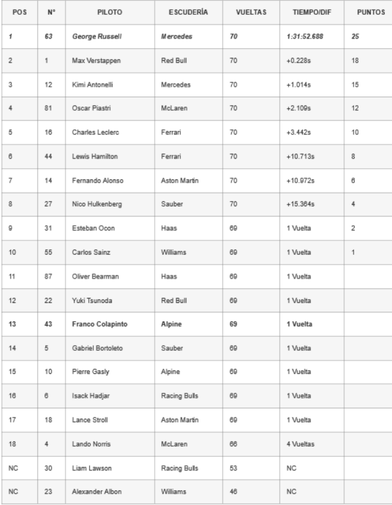 Previo al arranque de la carrera, los seguidores argentinos y latinoamericanos de Colapinto se llevaron un susto ante el inconveniente reportado en los frenos de su Alpine. Autorizado por la FIA, el equipo trabajó a contrarreloj para corregir el problema, lo que le permitió largar desde el 10° lugar.