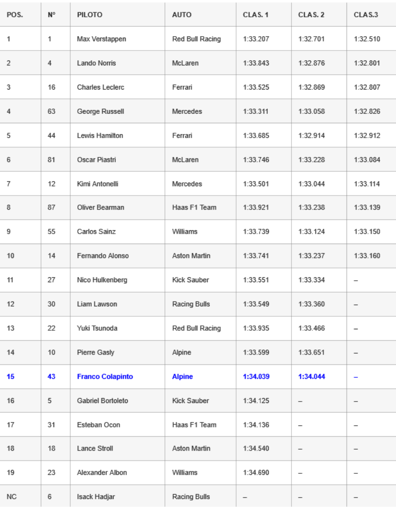 El top10 lo completaron Kimi Antonelli (Mercedes), Oliver Bearman (Haas), Carlos Sainz (Williams) y Fernando Alonso (Aston Martin); cabe señalar que en el comienzo de la actividad Isack Hadjar se despistó e impactó con su Racing Bulls contra las defensas y por ello no pudo marcar tiempos.