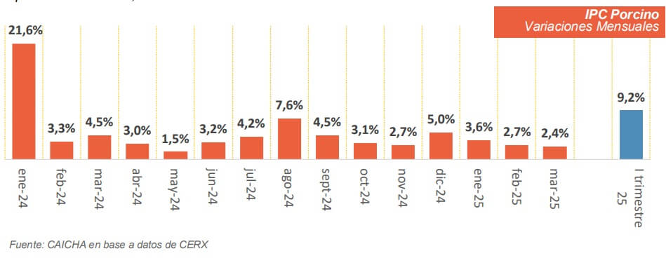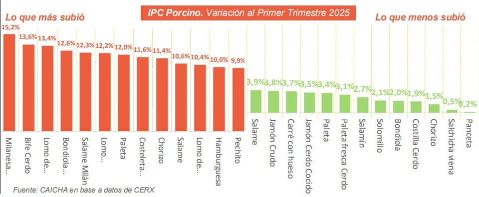 Según estimaron desde la Cámara Argentina de la Industria de Chacinados y Carne de Cerdo (Caicha), los precios de la carne de cerdo y chacinados (IPC-Porcino) aumentaron 9,2% durante el primer trimestre del año, apenas por encima de la inflación de 8,6% acumulada entre enero y marzo.