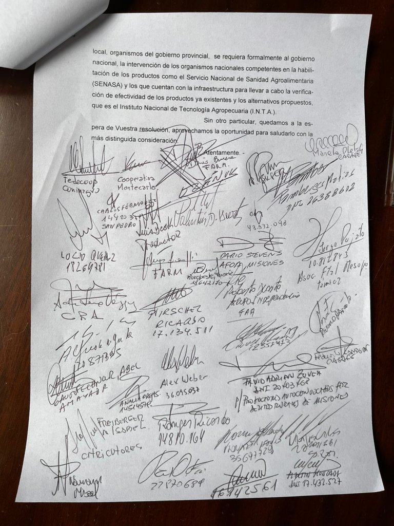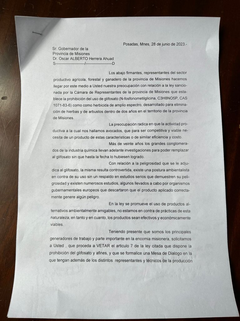 Así, “teniendo presente que somos los principales generadores de trabajo y parte importante en la encomia misionera, solicitamos a Usted, que proceda a vetar el artículo 7 de la Ley citada que dispone la prohibición del glifosato y afines, y que se formalice una Mesa de Dialogo”, continúa el escrito dirigido al Gobernador.