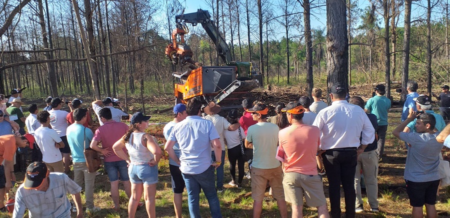 Durante la demostración, el asesor de Ventas de Industrias Guerra, Braise Alonso, explicó que se trata de un procesador apto para pino y eucaliptos, que cosecha, despeja y corta según la necesidad, con una productividad de 20 a 30 segundos por árbol, y una capacidad de procesado de hasta 6 metros por segundo.