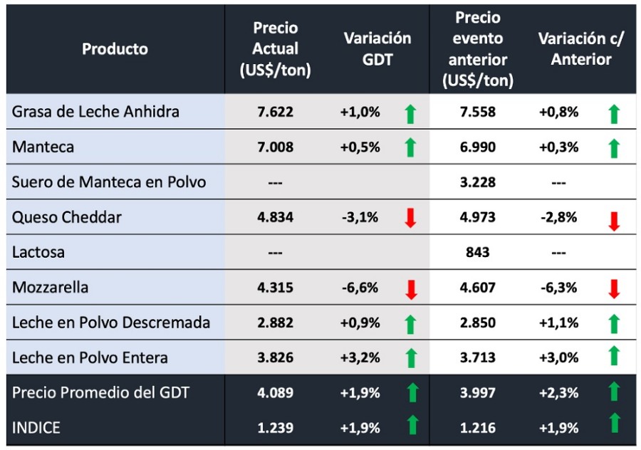 El índice de precios GDT (promedio ponderado de productos) se apreció un 1,9%, alcanzando los 4.089 dólares/tonelada, el valor más alto desde Julio de 2022.