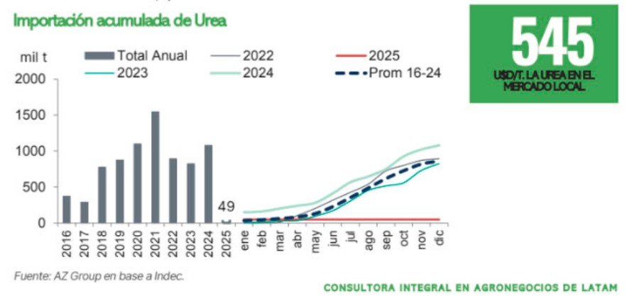 No solo es relevante el volumen total de las importaciones, sino también la variación en la composición de los agregados. Las importaciones de fertilizantes nitrogenados muestran un incremento interanual del 20% en comparación con 2023, mientras que este aumento se vio casi compensado por una disminución del 16% en las importaciones de fertilizantes fosforados.