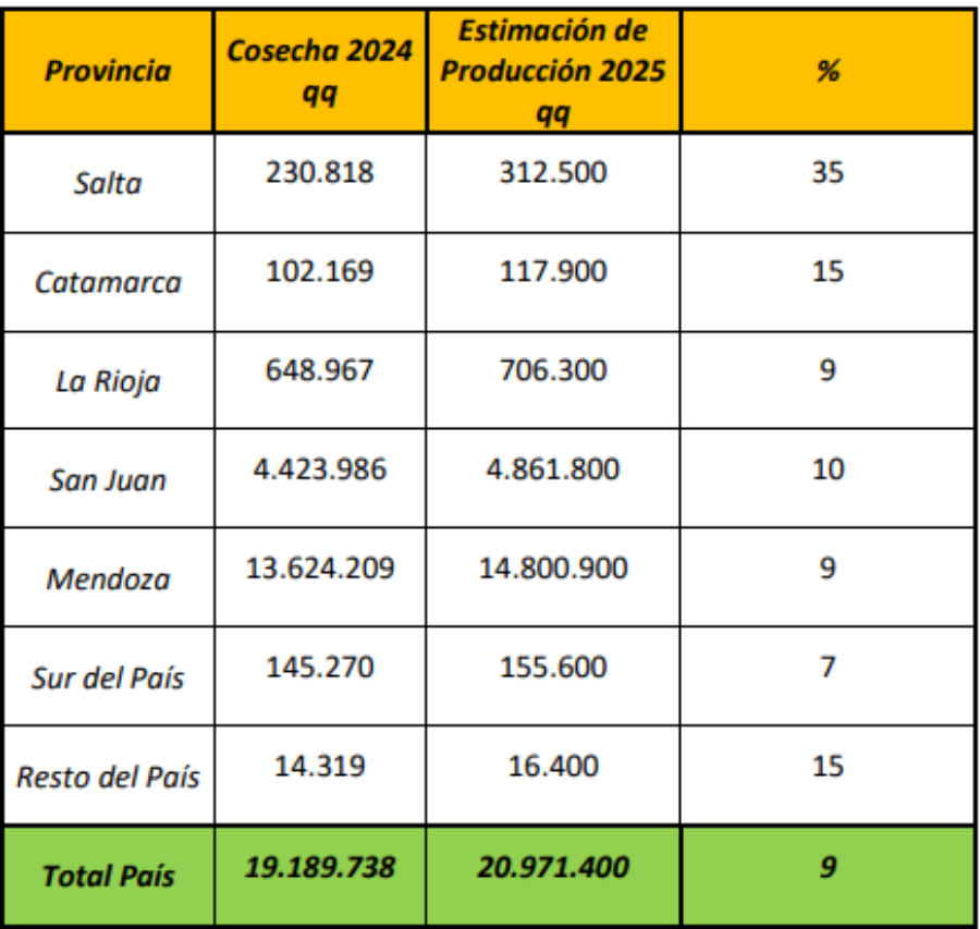 Luego viene La Rioja, con 706.300 quintales, y Salta, con 312.500 y la provincia donde se espera el salto interanual más grande: 35%.