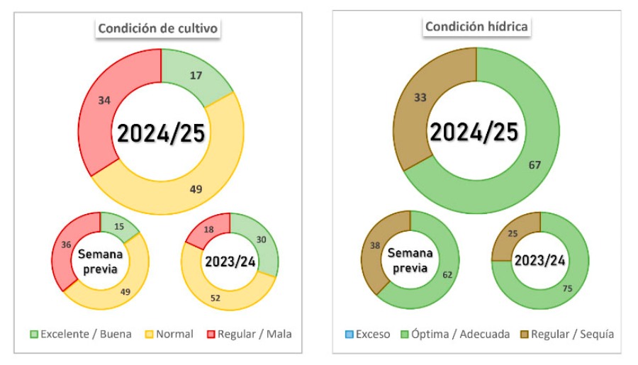 Desde la Bolsa de Cereales de Buenos Aires señalaron que se ha aumentado 1,2 puntos porcentuales el área de soja en condición de cultivo Normal/Excelente a nivel nacional. A su vez, el centro y norte del área agrícola han recibido aportes hídricos durante los últimos días, aunque el sur sigue bajo falta de humedad en el perfil.