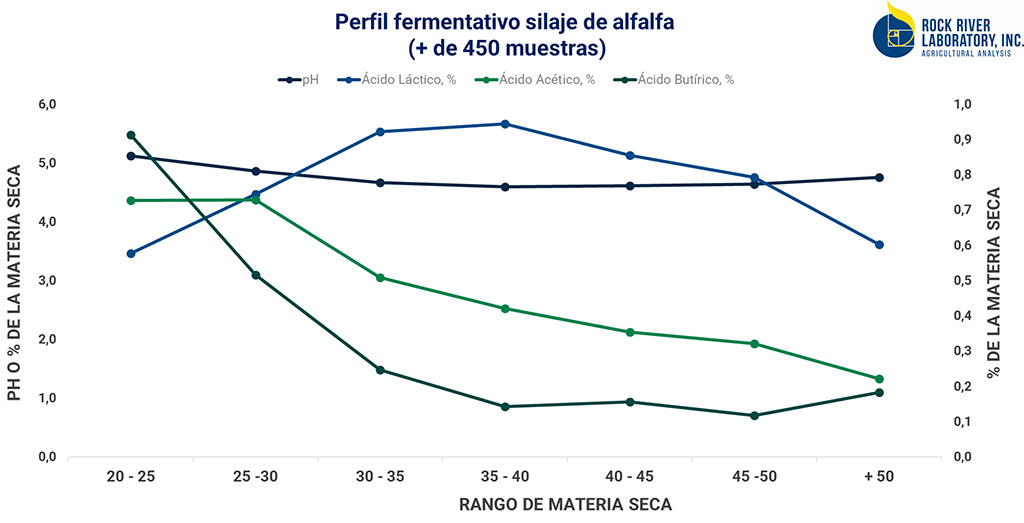 En el gráfico se puede observar los promedios de los perfiles fermentativos según los niveles de materia seca de más de 450 muestras recibidas por el Centro de Recepción de Muestras del Laboratorio.