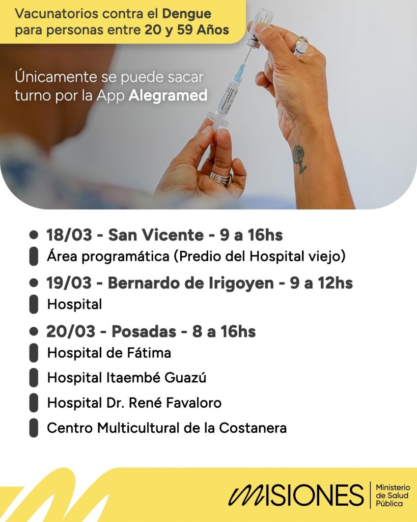 Continúa la campaña de vacunación contra el Dengue en la provincia de Misiones, en esta primera etapa para el grupo etario de 20 a 59 años. La única vía para solicitar la vacuna es a través de la aplicación ALEGRAMED, donde a través de una consulta médica podrán obtener un turno para su aplicación.