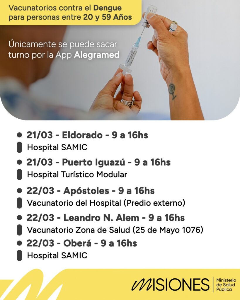 Viernes 22/3: Apóstoles: Vacunatorio del Hospital. (Predio externo)- 9 a 16 hs/ Leandro N. Alem: Vacunatorio Zona de Salud (25 de Mayo 1076)- 9 a 16 hs/ Oberá: Hospital SAMIC.- 9 a 16 hs