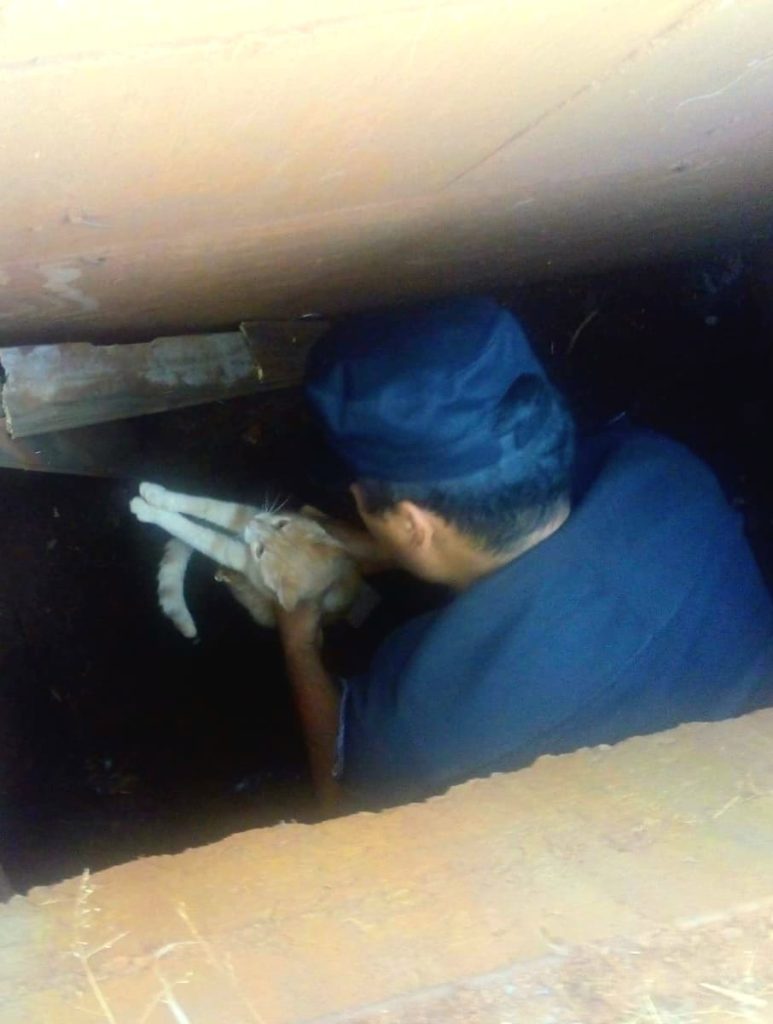 Finalmente, mientras los efectivos de la División Motorizada de Itaembé Guazú recorrían el Barrio 508 Viviendas, fueron requeridos por una vecina debido a que su gato, la mascota de la casa, se había caído a una boca de tormenta y no lograba salir, por lo que los agentes debieron ingresar a la zona de desagüe para extraer sin riesgo al animal.
