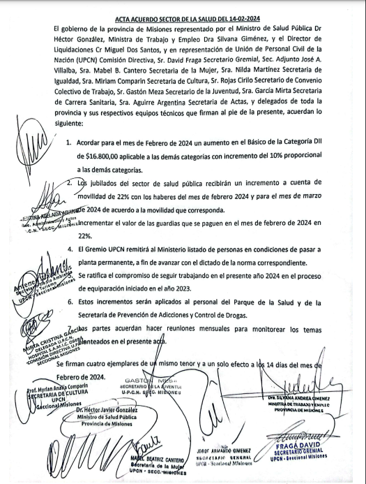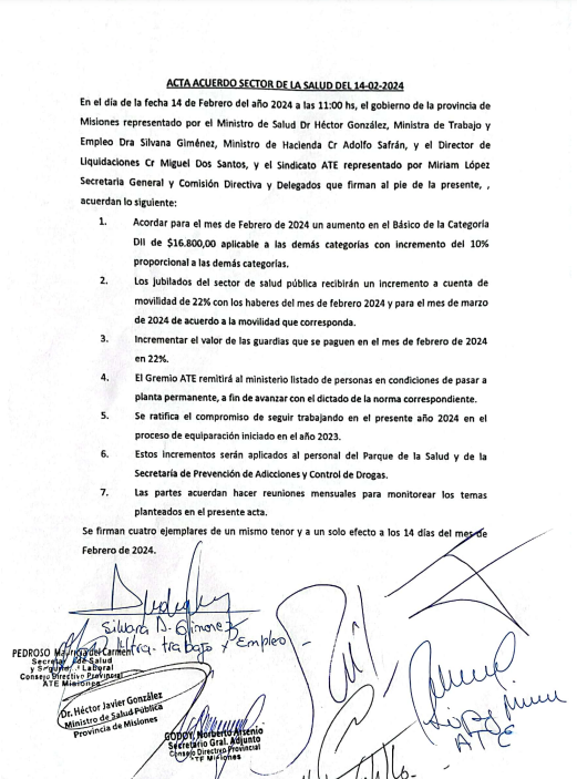 El Gobierno de la provincia de Misiones acordó con los gremios ATE y UPCN un incremento salarial para agentes de salud y el compromiso de mantener la mesa de diálogo para trabajar en beneficio del personal de salud.