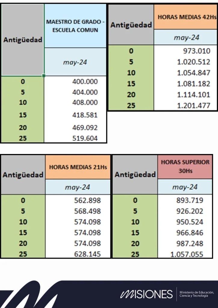 Esto se refleja en un aumento salarial del cargo testigo de maestra sin antigüedad que sube de 265 a 400 mil pesos. En este sentido, un docente de nivel primario y nivel inicial sin antigüedad con dos cargos cobrará 800 mil pesos: un docente de nivel secundario con 21 horas sin antigüedad cobrará 562.898 pesos, y si tiene las 42 horas sin antigüedad cobrará 973.010 pesos; un docente de nivel superior por 30 horas sin antigüedad cobrará 893.719 pesos, pudiendo también tomar 12 horas más de nivel secundario.