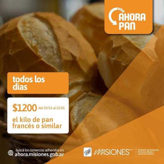 Tras llegar a un acuerdo con empresarios panaderos de la provincia de Misiones, a partir de hoy, martes 19 de Diciembre, se actualizan las condiciones del programa Ahora Pan, que hasta el 15 de Enero de 2024 seguirá vigente con un precio máximo de hasta 1.200 pesos por kilo de pan francés o similar. A partir de esa fecha, serán revisados nuevamente los términos del programa.