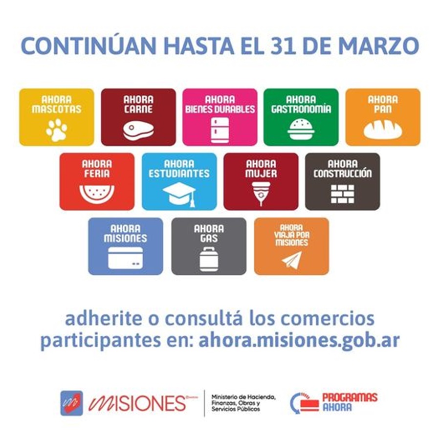 Los Programas que seguirán vigentes a partir del 1° de Enero de 2024 son; Ahora Misiones, Ahora Bienes Durables, Ahora Construcción, Ahora Estudiantes, Ahora Mascotas, Ahora Mujer, Ahora Viaja por Misiones, Ahora Gastronomía, Ahora Feria, Ahora Carne, Ahora Pan y Ahora Gas.