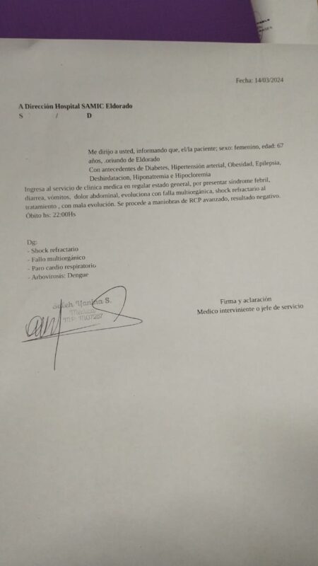 Oriunda de Eldorado. Con antecedentes de diabetes, hipertensión arterial, obesidad, epilepsia, deshidratación, hiponatremia e hipocloremia
