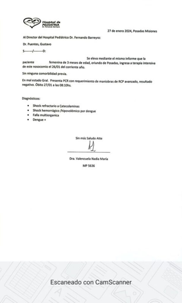 El Hospital de Pediatría Dr. Fernando Barreyro de la ciudad de Posadas, a través del Ministerio de Salud Pública de la provincia de Misiones, comunica parte médico sobre una paciente femenina de tres meses, oriunda de la ciudad de Posadas, que falleció por Dengue.
