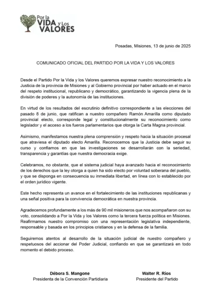 A través de un comunicado difundido este viernes, el Partido Por la Vida y los Valores anunció la liberación de Ramón Amarilla. “Celebramos que el sistema judicial haya avanzado hacia el reconocimiento de los derechos que la Ley otorga a quien ha sido electo por voluntad soberana del pueblo, y que se disponga en consecuencia su inmediata libertad, en línea con lo establecido por el orden jurídico vigente”, remarca el comunicado.