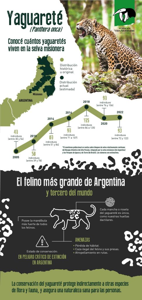 “Los datos del monitoreo demuestran que los esfuerzos de conservación del yaguareté están brindando resultados ya que dan cuenta de una población estable, pero sigue siendo imprescindible hacer más para que el felino y sus presas sobrevivan. Es por eso que el trabajo conjunto y el compromiso de organizaciones ambientales, la comunidad y el gobierno tiene que incrementarse. El yaguareté es considerado un indicador de la salud de la biodiversidad, y de los servicios ecosistémicos y la calidad de vida de las personas. Si el felino más grande de nuestro continente está en riesgo, nosotros también” indicó Fernando Miñarro, director de conservación de Fundación Vida Silvestre Argentina. “Además, tenemos el marco del nuevo acuerdo del Convenio de Diversidad Biológica que se alcanzó en diciembre de 2022 para que el incremento de los esfuerzos se haga realidad por el yaguareté y toda la biodiversidad. Es momento que los gobiernos nacionales y subnacionales transformen con fuerza los compromisos asumidos en acciones concretas, tangibles y medibles para encaminar la recuperación a 2030 de esta emblemática especie”.