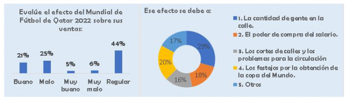 En ocasión de esta encuesta navideña, también los comercios minoristas fueron consultados acerca del efecto del mundial de futbol de Qatar 2022 sobre las ventas. Allí, el 44% comentó que fue regular, el 25% de los mismos informaron consecuencias negativas o malas, el 21% registró efectos buenos, el 6% muy malo y, por último, el 5% restante muy bueno.