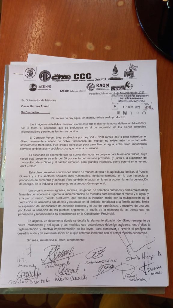 “Nos estamos quedando sin monte, sin agua y sin suelo productivo”, dijo Hugo Sand, de la Asociación de Productores Agropecuarios de Misiones (APAM). “Los primeros perjudicados con esta situación son los agricultores y las personas de menos recursos”, agregó por su parte Salvador Torres, del Movimiento Agrario de Misiones (MAM).