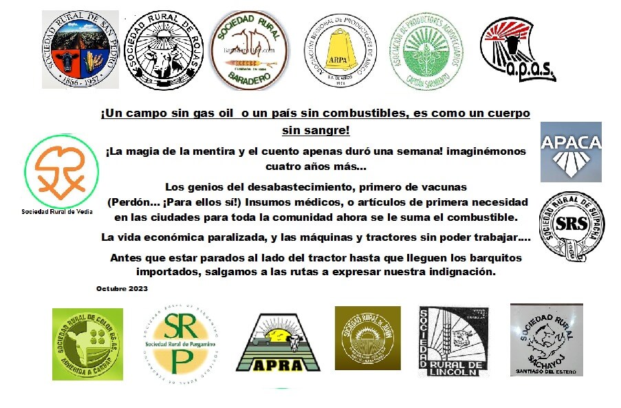 Ante el escenario de falta de gasoil, un grupo de sociedades rurales del norte bonaerense y una entidad de Santiago del Estero convocaron a una jornada de protesta, que se llevará a cabo el jueves 2 de Noviembre, en el cruce de las rutas 8 y 41, en la localidad de San Antonio de Areco - provincia de Buenos Aires.