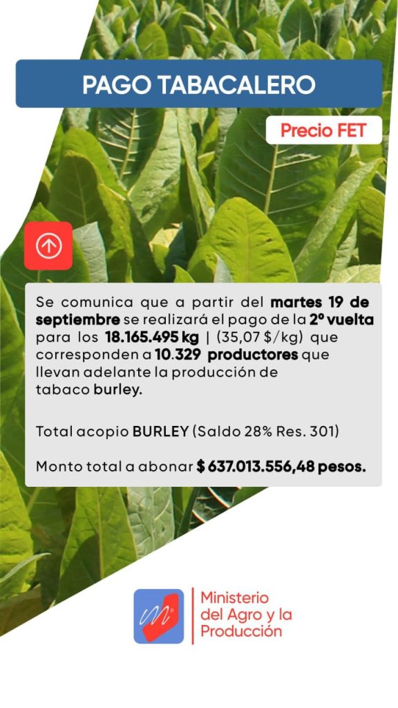 En un escueto comunicado la Prensa del Agro Misiones informan que a partir del martes 19 de Septiembre se realizará el pago de la 2° vuelta para los 18.165.495 kilos | (35,07 pesos / kg) que corresponden a 10.329 productores que llevan adelante la producción del tabaco burley.