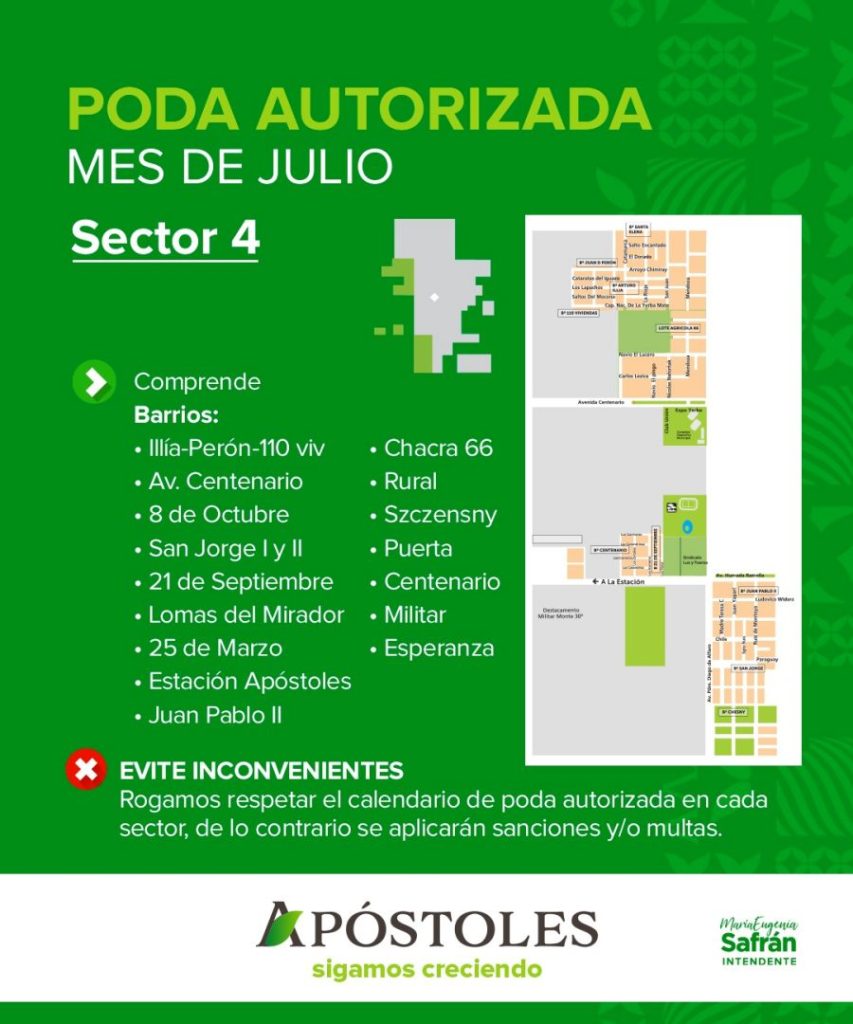 La Secretaría de Medio Ambiente del Municipio misionero de Apóstoles informa que durante el mes de Julio se realizarán labores de poda autorizadas en el Sector IV de la ciudad.