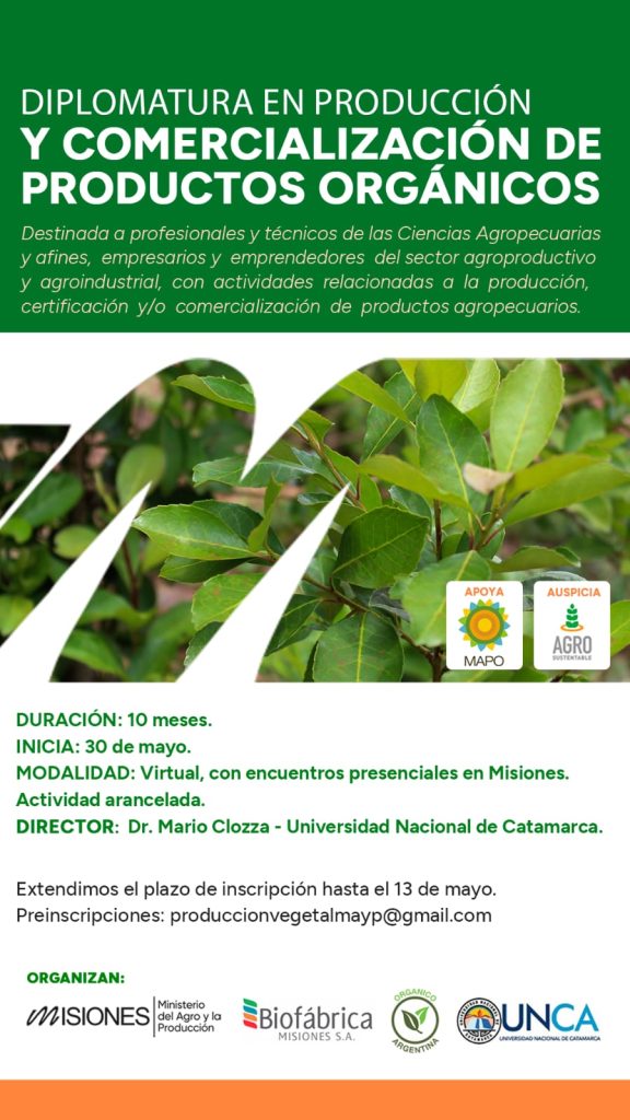 El Ministerio del Agro y la Producción de la provincia de Misiones y la Facultad de Ciencias Agrarias de la Universidad Nacional de Catamarca firmaron un convenio de cooperación técnica para el dictado de la Diplomatura en Producción y Comercialización de Productos Orgánicos, con el objetivo de promover la formación de recursos humanos en la normativa orgánica.