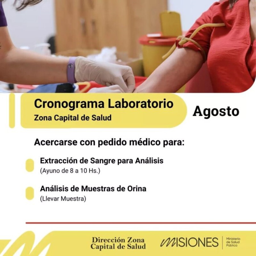 En este mes de Agosto, la Dirección de Bioquímica del Ministerio de Salud Pública de la provincia de Misiones junto con la Zona Capital de Salud estarán llevando adelante el cronograma para la Red de Laboratorios de análisis clínicos en los Centros de Salud de la ciudad de Posadas y la localidad de Garupá.