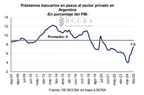 Pero dentro de esa película, la foto positiva es que precisamente ese piso de Abril del año pasado marca el inicio de una fase de recuperación de la participación de los préstamos en el PBI, que alcanzó el 7,5% en Febrero de 2025, acumulando así diez meses de crecimiento.