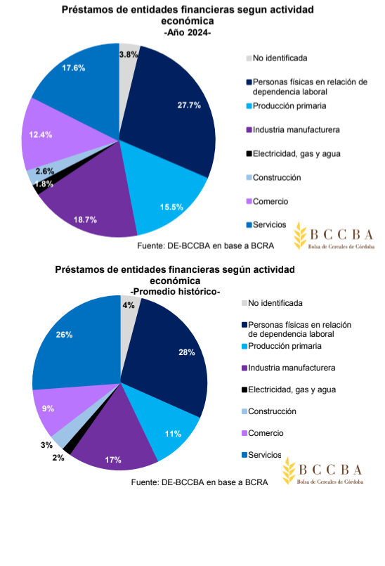Al mirar esta serie larga y separar los préstamos de entidades financieras según actividad económica, en promedio, las personas físicas en relación de dependencia laboral son las principales receptoras con el 28% de participación en el total, seguido por los servicios con el 26% y la industria manufacturera con el 17% de intervención. La actividad primaria se ubica en cuarto lugar con el 11% de participación promedio.