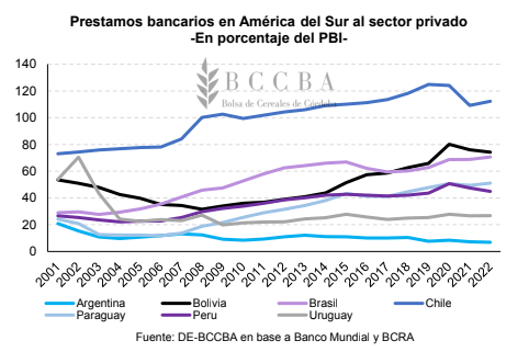 Si se relaciona el volumen de préstamos con el Producto Bruto Interno (PBI), por ejemplo, en Argentina es apenas 9,5%, cuando en los países de América del Sur el promedio es 52%; y en naciones avanzadas como; Estados Unidos, Suiza, Japón y China, se ubica en 175%.