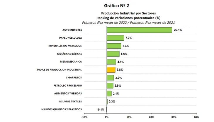 En cuanto al desempeño de las ramas industriales entre enero y octubre y en la comparación con el mismo periodo del año pasado, la producción automotriz lidera con holgura el ranking de crecimiento acumulando un avance del 29,1%.