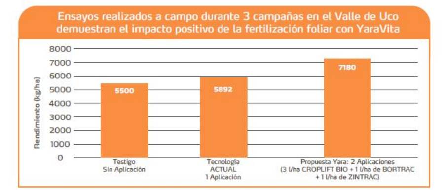 La información consolidada en ensayos realizados en el Valle de Uco durante 3 campañas, arroja un incremento de más de 1600 kilos por hectárea al compararlo con el testigo sin fertilización foliar, mientras que, si se contrasta con el manejo tradicional en la zona, el incremento es de 1200 kilos de uvas extras. El principal diferencial entre los resultados se basa en la incorporación de micronutrientes y bioestimulantes en el manejo nutricional del cultivo. Esto genera, por un lado, un efecto positivo al mitigar los efectos del estrés asociado a factores bióticos y abióticos y, por otro, brinda un complemento de nutrientes en momentos críticos.